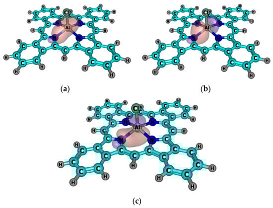 The HOMO predominantly represented the linear combination of atomic orbitals (AOs) of the pyrrole rings, whereas the HOMO-1 was localized on the carbon atoms in the meso-positions. Furthermore, HOMO-1 and HOMO-2 orbitals contained both AOs of the macrocycle and axial ligand Cl for Al, Ga and In complexes. The contribution of the metal to this orbital was slight.