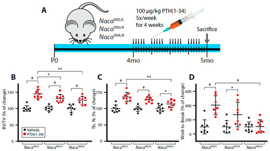 Mutation of the PKA phosphoacceptor site within the NACA sequence impairs the osteoanabolic response to intermittent PTH treatment. Four-month-old female mice were treated once daily, 5 days/week for 1 month with 100 μg/kg of PTH(1-34) (A). Vertebrae were analyzed by μCT (B,C) and compression testing (D). BV/TV, bone volume/tissue volume; Tb. N., trabecular number. Results are expressed as change from vehicle-treated animals, which are ascribed a value of 100%. * p < 0.05; ** p < 0.01; # p < 0.0001, two-way analysis of variance (ANOVA) with post hoc tests.