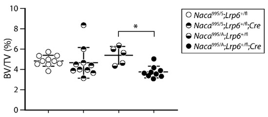 2.2. Phenotype of Compound Naca99S/A;Lrp6+/fl;Ocn-Cre Heterozygous Mice (Compound Heterozygotes)