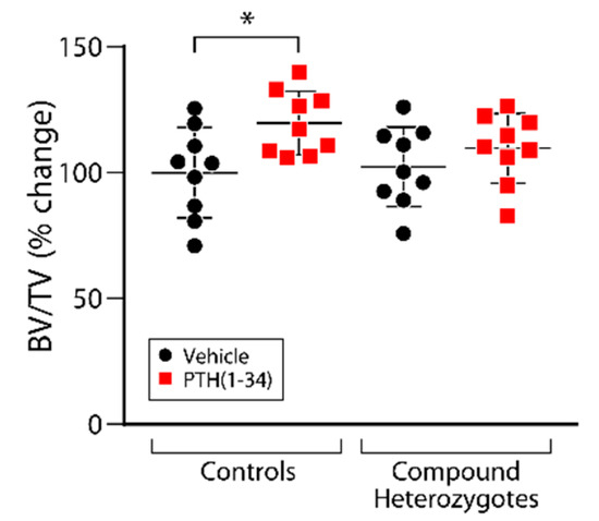 The osteoanabolic response to iPTH is inhibited in Naca/Lrp6 compound heterozygotes. Four-month-old female mice were treated once daily, 5 days/week for 1 month with 100 μg/kg of PTH(1-34). Vertebrae were analyzed by μCT. BV/TV, bone volume/tissue volume. Results are expressed as change from vehicle-treated animals, which are ascribed a value of 100%. * p < 0.05, two-way ANOVA with post hoc tests.