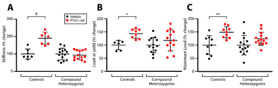 The increase in biomechanical properties induced by iPTH treatment is blunted in Naca/Lrp6 compound heterozygotes. Four-month-old female mice were treated once daily, 5 days/week for 1 month with 100 μg/kg of PTH(1-34). L2 vertebrae were analyzed by compression testing to measure stiffness (A), load at yield (B) and maximum load (C). Results are expressed as change from vehicle-treated animals, which are ascribed a value of 100%. * p < 0.05; ** p < 0.01; # p < 0.0001, two-way analysis of variance (ANOVA) with post hoc tests.
