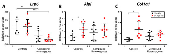 The expression of Lrp6 was reduced in compound heterozygous animals (Figure 5A), although we did not detect changes in Naca expression (data not shown). In response to iPTH treatment, control mice showed increased expression of alkaline phosphatase (Alpl, Figure 5B) and the alpha 1 chain of type I collagen (Col1a1, Figure 5C), but this was not observed in compound heterozygotes (Figure 5).