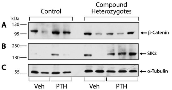 We assessed the impact of gene dosage manipulation for Naca and Lrp6 on other signaling pathways acting downstream from iPTH administration. We observed sample-to-sample variation in low-abundance protein recovery from TRIzol extracts (Figure 6A,B). Despite this fact, we can assess that total β-catenin was increased by iPTH treatment in control littermates but not noticeably in compound heterozygotes (Figure 6A). On the contrary, there were no major changes in SIK2 protein levels following iPTH injections in controls, but SIK2 was markedly enhanced in compound heterozygotes after the iPTH regimen (Figure 6B), suggesting potential compensatory mechanisms.