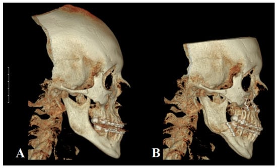 Representative 3D reconstructions of cone beam computed tomography (CBCT) examinations. Patient was diagnosed with class III skeletal malocclusion. (A) CBCT performed during pre-surgical orthodontic treatment. (B) Postsurgical treatment CBCT. The Le Fort I osteotomy of maxilla and the bilateral sagittal split osteotomy of mandible have been performed. The protrusion of maxilla and the retrusion of mandible were conducted to restore proper occlusal status. Osteosynthesis elements are visible (white) within both jaws.