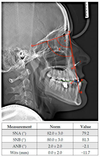 Representative cephalometric X-ray and part of cephalometric analysis according to Segner and Hasund presenting patients diagnosed with skeletal class III malocclusion before treatment. A-SNA; β-SNB; γ-ANB (white arrow); A’-B’0Wits (blue line); green line-occlusal plane. See the details description in text and Supplementary Materials section (Table S1) for all cephalometric measurements.