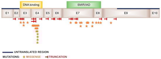 Schematic representation of mutation types within the IRF6 gene. DNA binding—winged-helix DNA binding domain; SMIR/IAD—protein binding domain.