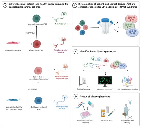 - Waite, A.J.; Millar, D.; Clarke, A. The Generation of an Induced Pluripotent Stem Cell Line (DCGi001-A) from an Individual with FOXG1 Syndrome Carrying the c.460dupG (p.Glu154fs) Variation in the FOXG1 Gene. Stem Cell Res. 2020, 49, 102018. [Google Scholar] [CrossRef]
