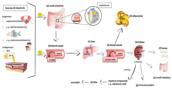 Schematic absorption, distribution, metabolism, and clearance of vitamin D indicating the strategic tissues/organs involved (a–h) and sources of the molecule. Main exogenous source of vitamin D are oily fish and mushrooms, apart from pharmaceutical supplements. The other source of the molecule is its synthesis in the epidermis layer of the skin. Under the influence of ultraviolet (UVB) radiation, 7-dehydrocholesterol undergoes nonenzymatic photoisomerization into pre-vitamin D. Next, pre-vitamin D is transformed into cholecalciferol in a heat-dependent process and comes out of the skin to the blood and binds to vitamin D-binding protein (VDBP) (b). Vitamin D from the diet is transported in blood mainly in chylomicrons (a). Next, both skin and diet-derived vitamin D reach the liver (c) and is hydroxylated into 25(OH)D (calcidiol) by 25-hydroxylase (CYP2R1). 25(OH)D leaves the liver and is bound to VDBP (b), which presents the highest affinity to calcidiol. 25(OH)D-VDBP is the major circulating form of vitamin D. Then, calcidiol is internalized by target tissues, mostly the kidneys (e), where it is transformed into the active form 1,25(OH)2D (calcitriol) by 1-hydroxylase (CYP27B1). CYP27B1 is expressed not only in the kidneys but also in numerous different cells, including adipocytes (d). The main function of vitamin D is to regulate calcium and phosphate homeostasis. The two main effector organs related to this function, on which the active metabolites of vitamin D act, are the intestines (a) and bones (f), and the molecule also exerts immunomodulatory effects (g). Calcitriol is able to stimulate its own degradation by the induction of 25(OH)D-24-hydroxylase (CYP24A1). CYP24A1 is an enzyme degrading both calcitriol and its precursor calcidiol to biological inactive metabolites, including calcitroic acid, which is excreted with bile (h). Abbreviations: D2, egrocalciferol, plant origin vitamin D; D3, cholecalciferol, animal origin food vitamin D; UVB, ultraviolet radiation; SR-B1, scavenger receptor class B type 1; CD36, class B scavenger receptor; NPC1-L1, Niemann-Pick C1-Like 1; CYP2R1, cytochrome P450 family 2 subfamily R member 1; CYP24A1, cytochrome P450 family 24 subfamily A member 1; CYP27B1, cytochrome P450 family 27 subfamily B member 1; CYP24A1, cytochrome P450 family 24 subfamily A member 1.