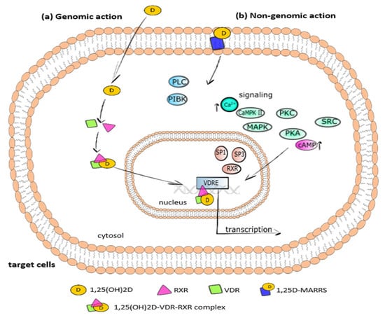 Physiologically, 1,25(OH)2D binds to VDR, which plays a role as a nuclear receptor and transcription factor. Vitamin D evokes genomic and nongenomic responses [,], as shown in Figure 2. In the genomic response after the interaction between 1,25(OH)2D and cytosolic VDR, VDR binds to the retinoid X receptor (RXR) (Figure 2a). The formed 1,25(OH)2D–VDR–RXR complex translocates from the cytoplasm to the nucleus and attaches to the vitamin D response element (VDRE) in the promoter region of vitamin D-dependent genes. Then, numerous enzymatic coregulatory complexes involved in the facilitation of histone epigenetic modification, the remodeling of chromatin, and the recruitment of local RNA polymerase II are mobilized and recruited. Finally, the expression of various vitamin D-dependent genes is regulated.