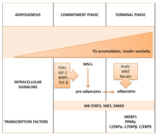 In the commitment phase, several intracellular signaling molecules, i.e., fibroblast growth factors (FGFs), insulin like growth factor 1 (IGF-1), bone morphogenetic proteins (BMPs), and transforming-growth factor β (TGF-β), induce MSCs to form preadipocytes []. To proceed, further changes of preadipocytes, differentiation factors, are required to be secreted from their suppressive signaling molecules, including preadipocyte factor 1 (Pref1) [], members of the wingless (WNT) family [], Necdin, a member of the melanoma-associated antigen family of proteins [], and proteins of the retinoblastoma (Rb) family [].