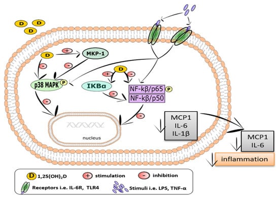 Vitamin D reduces the level of phosphorylated p38 MAPK and Erk 1/2, as well as increases the level of MAPK phosphatase-1 (MKP-1). In turn, MKP-1 inactivates MAPK signaling via the suppression of p38 activation. The presented effect of vitamin D has been shown both in pre-adipocytes and differentiated adipocytes [,,,]. A VDR-binding site has been identified in human, as well as mouse, MKP-1 promoters []. Both calcitriol and calcidiol have been reported to reduce LPS-induced TNF-α and IL-6 production via the suppression of p38 MAPK activation in human monocytes/macrophages [].