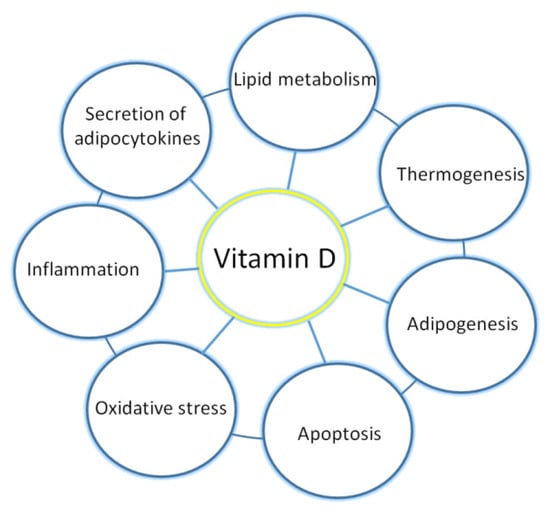 The growing body of evidence has revealed that vitamin D via its molecular mechanism of action is involved in numerous processes in adipose tissue, including adipogenesis, adipocyte apoptosis, metabolism of lipids, thermogenesis, and inflammation.