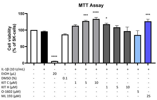 Effects of KIT C (light grey bars), KIT H (dark grey bars), O-1602 (light blue bar), and ML 193 (blue bar) on cell viability in IL-1β-stimulated SK-N-SH cells (24 h treatment). Cell viability was measured by change in color due to MTT-oxidation, and absorbance was measured at 595 nm using an ELISA-reader. Values are presented as the mean ± SEM of at least three independent experiments. Statistical analysis was performed using one-way ANOVA with Dunett’s post hoc tests with * p < 0.05, *** p < 0.001, **** p < 0.0001 compared to untreated cells. The figure is derived from our previous publication [].