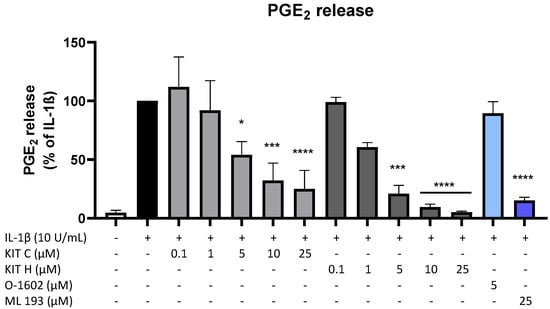 Since PGE2 is the central molecule in the AA/COX-2/PGE2 pathway and acts pro-inflammatory, next we investigated the effects of KIT C, KIT H, O-1602, and ML 193 on PGE2-release in IL-1β-stimulated SK-N-SH cells. KIT C (light grey bars), as well as KIT H (dark grey bars), showed a significant and concentration-dependent reduction of IL-1β-induced PGE2-levels (Figure 2) starting at concentrations of 5 µM. KIT H elicited a more potent PGE2-reduction than KIT C, reaching basal PGE2-concentrations of untreated cells in the concentration of 25 µM. ML 193 (blue bar), a GPR55 antagonist, also showed significant inhibition of IL-1β-mediated PGE2-release, with an effect size between KIT C and KIT H. O-1602 (light blue bar), a potent GPR55 agonist, did not significantly inhibit IL-1β-induced PGE2-synthesis.