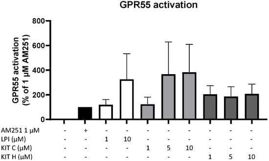To prove whether the observed anti-inflammatory effects of KIT C and KIT H are mediated via GPR55, a GPR55 activation assay was performed (Figure 3). AM251 (1 µM), a GPR55 agonist with additional activities at CB1- and CB2-receptors, and LPI (10 µM), the physiological agonist of GPR55, were used as positive controls. KIT C in concentrations of 5 and 10 µM showed about a 4-fold higher GPR55 activation than 1 µM AM251 without reaching significance but showing a clear trend. KIT H revealed about a 2-fold but not significantly higher GPR55 activation than 1 µM AM251 in all tested concentrations, comparable to the GPR55 activation capacity of 10 µM LPI.