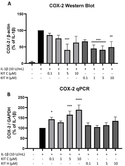 Effects of KIT C (light grey bars) and KIT H (dark grey bars) on COX-2 protein levels (A) and COX-2 mRNA expression (B) in IL-1β-stimulated SK-N-SH cells. Cells were stimulated and analyzed as described under material and methods. Values are presented as the mean ± SEM of at least three independent experiments. Statistical analysis was performed using one-way ANOVA with Dunnett’s post hoc tests with * p < 0.05, ** p < 0.01, *** p < 0.001 and **** p < 0.0001 compared to IL-1β.