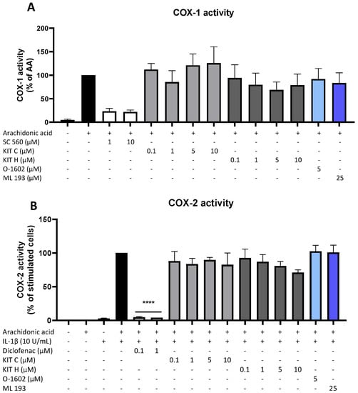 Effects of KIT C (light grey bars), KIT H (dark grey bars), O-1602 (light blue bar), and ML 193 (blue bar) on COX-1 (A) and COX-2 enzyme activities (B) in SK-N-SH cells. (A) COX-1-activity was measured after 15 min of incubation with arachidonic acid (AA). Levels of PGE2 in the supernatants were quantified by EIA. (B) After 24 h of IL-1β pre-stimulation, 15 µM of arachidonic acid (AA) was added and PGE2-release was measured by EIA. Values are presented as the mean ± SEM of at least three independent experiments. Statistical analysis was carried out by using one-way ANOVA with Dunnett’s post hoc tests with **** p < 0.0001 compared to AA (A) or IL-1β with AA (B).