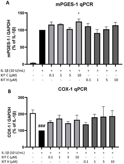 Next, we studied the effects of KIT C (light grey bars) and KIT H (dark grey bars) on two other important enzymes involved in the AA/PGE2 pathway, COX-1 and mPGES-1. The expression of both enzymes was evaluated using qPCR. The expression of mPGES-1 (Figure 6A) was strongly induced by IL-1β-treatment for 4 h and 10 µM of KIT C slightly but significantly increased mPGES-1 expression compared to the IL-1β positive control. KIT H did not affect IL-1β-stimulated mPGES-1 expression. COX-1 expression (Figure 6B) was decreased by stimulation with IL-1β, and KIT C, as well as KIT H, partially ameliorated the IL-1β-induced reduction of COX-1 expression.