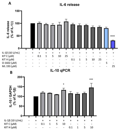 Besides the AA/PGE2 pathway, the effects of KIT C (light grey bars) and KIT H (dark grey bars) on IL-1β-induced IL-6 as pro-inflammatory and IL-10 as anti-inflammatory cytokines were investigated (Figure 7). Stimulation with IL-1β for 24 h potently induced IL-6 release in SK-N-SH cells but neither KIT C nor KIT H nor O-1602 affected IL-6 production (Figure 7A). The GPR55 antagonist ML 193, however, significantly reduced IL-1β and increased IL-6 release by about 60% in IL-1β-treated SK-N-SH cells.