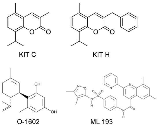 Figure 9 shows the chemical structure of KIT C and KIT H that were already introduced in a previous paper [], as well as the structures of O-1602 and ML 193 obtained from the manufacturer’s (Cayman Chemicals, Ann Arbor, MI, USA) website.