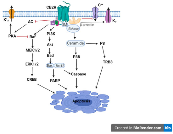 CB2R signaling. CB2R activation is associated with the Gβγ-dependent activation of the different MAPK cascades, and the Gαi/o-dependent inhibition of AC activity, in turn, results in the inhibition of A-type potassium channels (K + A). CB2R activation also results in the inhibition of specific calcium channels (Ca++), enhances the opening of inwardly rectifying potassium (Kir) channels, and stimulates the de novo synthesis of ceramide and the recruitment of β-arrestin. This figure is only a depiction of one outcome; these pathways can have multiple outcomes—ranging from stimulation of growth, manipulation of metabolism, control of the immune system to cell death—and the outcome is very context- and cell-dependent. The modulation of calcium alone can have multiple outcomes.