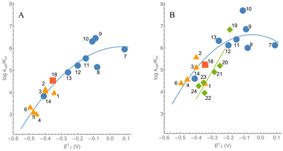 The dependence of the reactivity of quinones (blue disks), aromatic N-oxides (orange triangles), nitroaromatic compounds (green diamonds) and benzylviologen (red rectangle) on their single-electron reduction midpoint potentials (E17) at pH 7.0 in the absence (A) and presence (B) of CAM and Ca2+. The numbers of compounds are given in Table 1.