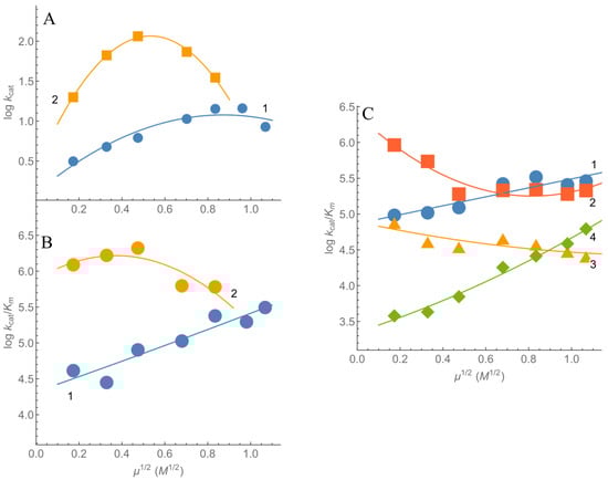 Next, we examined the effects of the ionic strength of the solution on the reactivity of electron acceptors. Electrostatic interactions play important role in the electron transfer reactions of FMN, first in the association of the FMN-binding domain with the FAD-binding domain, and, after the conformational change, in its complex formation with the heme domain [6,35,36,37,38,39]. However, most studies on the effects of ionic strength on the reactivity of nonphysiological oxidants were performed with their fixed concentrations, and provided limited information on the mode of their interaction with the FMN domain [35,37,38].