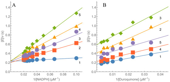 Analogously, the rate constants of Fe2+-NO formation during the enzyme reduction by NADPH (kred) were calculated according to Equation (5) [42], where kox is the rate constant of reoxidation at particular duroquinone concentration, and [E]t is the total enzyme concentration: