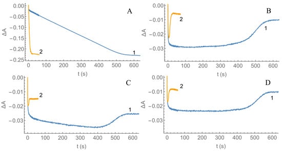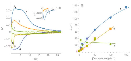 The addition of duroquinone enhances the flavin reoxidation and decreases the amplitude of absorbance changes at 485 nm (Figure 6A). The kinetics of reoxidation were analyzed by the method of Chance [42] using Equation (4):