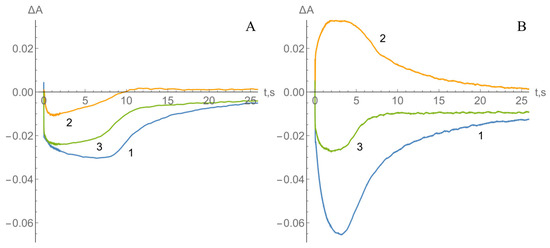 Multiple turnover kinetics of nNOS reduction and reoxidation by O2 in the presence of NADPH, CAM, H4B (A) and NADPH, CAM, H4B and Arg (B). The absorbance changes were followed at 397 nm (1), 436 nm (2). 485 nm (3). Concentrations of nNOS and NADPH after mixing, 2.0 µM and 30 µM.