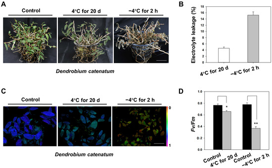 Analysis of cold resistance of D. catenatum. (A) Representative phenotypes of plants under chilling (4 °C for 20 d) and freezing (−4 °C for 2 h) conditions (bar = 5 cm). (B) Electrolyte leakage (EL) of the leaves of D. catenatum after chilling (4 °C for one week) and freezing (−4 °C for 2 h) stress. (C) Chl fluorescence imaging of D. catenatum after chilling and freezing stress (bar = 2 cm). (D) Fv/Fm ratios of D. catenatum after chilling and freezing stress. Data are the mean ± SD of three independent biological replicates. Statistical analyses were performed using a Student’s t test. **, p < 0.01; and *, p < 0.05.