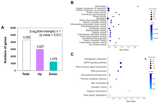 We further determined the differentially expressed genes (DEGs) between D. catenatum with and without cold stress using DESeq (q value < 0.01); FPKM values were used to represent the gene expression levels. If a gene showed a |Log2 (fold-change)| ≥ 1 (q value < 0.01) in expression in two contrasting groups, the gene was considered differentially expressed. As shown in Figure 2A, a total of 4302 DEGs were detected in chilled-stress plants compared to control plants. Among these DEGs, the upregulated DEGs were 3208 and the downregulated DEGs were 1275 in cold-treated plants (Table S5).