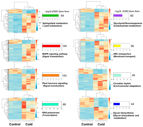 To validate the reliability of the gene expression patterns of DEGs from RNA-Seq data, eight DEGs were randomly selected for analysis by RT–qPCR using gene-specific primers (Figure 4). As expected, the expression levels of these candidate genes obtained by RT–qPCR were consistent with the fold change value of the corresponding genes in RNA-Seq data (Table 1). These results confirm the reliability of the RNA-Seq analysis and reflect the real transcriptomic changes in D. catenatum responding to cold stress.