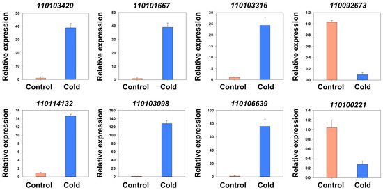 RT–qPCR validation of candidate differentially expressed genes linked to cold resistance in D. catenatum. Data are the mean ± SD of three independent biological replicates.