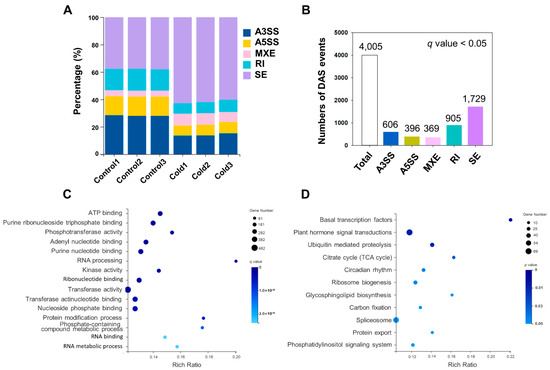 rMATS (http://rnaseq-mats.sourceforge.net, accessed on 1 January 2022) was used to identify five basic types of AS events, SE, MXE, A5SS, A3SS and RI, from RNA-Seq clean reads [47]. DAS events were identified between samples with and without chilling stress using rMATS software. An FDR q value ≤ 0.05 was set as the criterion for DAS.