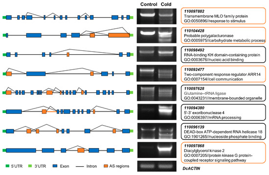 To evaluate the reliability of these cold-responsive splicing events, RT–PCR was performed on eight selected genes (predicted with IR/ES events) using RNA isolated from D. catenatum leaves (with and without cold stress) (Figure 6). The results showed that cold stress induced more AS events or changed the isoforms of AS events compared to normal plants. These differences resulted from exon or skipping intron retention by sequencing and BLAST. The alternative splicing patterns of these eight examined genes by RT–PCR were highly consistent with RNA-Seq, which confirms the reliability of our RNA-Seq analysis and indicates that AS events were promoted in D. catenatum under cold conditions.