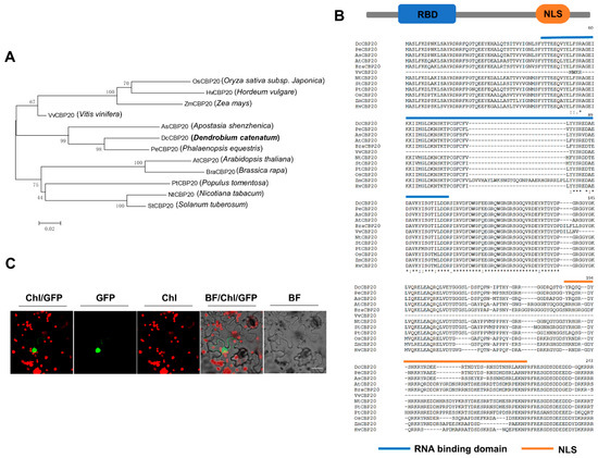 A previous study revealed that the proportion of uncapped transcripts that were alternatively spliced was significantly increased when exposed to cold stress [35]. CBP20, as an important subunit of the nuclear cap-binding complex (CBC), can improve the stability of transcripts [25]. Meanwhile, it has been reported that CBP20 is involved in drought and salt stress by regulating alternative splicing events [29]. In this study, we found that Arabidopsis cbp20 mutant plants showed great sensitivity to chilling stress at 4 °C (Figure S6), which indicated that CBP20 may be required for cold tolerance in plants. Thus, using the Download BLAST Software and Databases of NCBI (https://ftp.ncbi.nih.gov/blast/executables/igblast/release/LATEST/, accessed on 1 January 2022), the full-length CDS of AtCBP20 (AT5G44200) was as a “Query” sequence to extract the homologous DcCBP20 from the D. catenatum CDS database. We identified and cloned the homologous gene of CBP20 in D. catenatum, which was only a single gene. Sequence alignment and phylogenetic analysis found that CBP20 showed high similarities with the CBP20 sequences of two Orchidaceas species, Apostasia shenzhenica and Phalaenopsis equestris (Figure 8A). We further found that DcCBP20 exhibited two conserved motifs: an RNA binding domain (RBD) motif and a NLS motif (Figure 8B). We subsequently generated the 35S::DcCBP20-GFP construct and detected the subcellular localization of the DcCBP20 protein using a transient expression assay in N. benthamiana. As shown in Figure 8C, GFP fluorescence was detected only in the nucleus, which is consistent with the subcellular location of CBP20 in Arabidopsis.