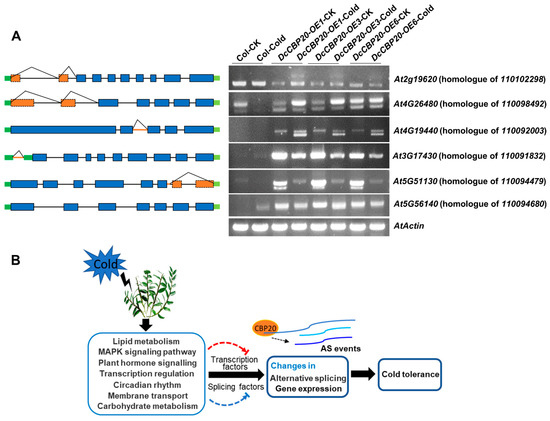 Function of CBP20 homologous gene of D. catenatum in response to cold. (A) The splicing isoforms of the PCR products using specific primers in cDNA of DcCBP20 transgenic Arabidopsis detected by RT–PCR. The wild type and DcCBP20 transgenic Arabidopsis were treated with or without 4 °C for 12 h, three independent transgenic lines of DcCBP20-OE were used for RT-PCR analysis. (B) A model of the cold signaling pathway in D. catenatum. Under cold stress, differentially expressed genes responding to cold stress in D. catenatum by RNA-Seq were mainly related to lipid metabolism, protein kinase activity, plant hormone signaling transduction, transcription regulation, circadian rhythm, membrane transport and carbohydrate metabolism. These processes activate or suppress transcription factors and splicing factors, which respond to cold stress. These factors further function in the alternative splicing and gene expression of downstream targets. During this process, CBP20 mediates alternative splicing events to respond to cold stress in D. catenatum.