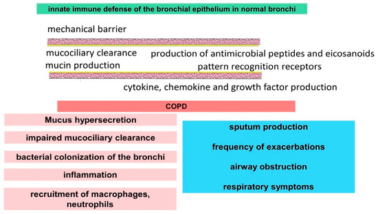 In COPD, these mechanisms may be impaired, accompanied by mucus hypersecretion. Mucus hypersecretion is associated with mucins, of which MUC5AC is considered the most important [31,32]. MUC5AC is produced predominantly by goblet cells of the bronchial epithelium [33]. Overproduction of MUC5AC in COPD leads to increased airway obstruction by mucus [31]. Elevated concentrations of MUC5AC in the airways may contribute to the development and progression of COPD and are associated with clinical manifestations of the disease, including declines FEV1 and increased risk of exacerbations [34]. Increased sputum production is thought to be one of the clinical characteristics of the bronchial phenotype of COPD. In addition to affecting the quantitative and qualitative parameters of mucus, exposure to cigarette smoke reduces cilia length, which also reduces the efficiency of mucociliary clearance [35].