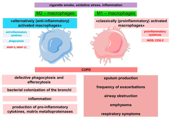 Macrophage polarization is based on changes in cell metabolism [128]. Polarization is driven by humoral factors and changes the role of macrophages in the inflammatory process. The role of individual macrophage phenotypes in the pathogenesis of COPD is unclear. While alveolar macrophages were mostly unpolarized in normal lungs, M1 and M2 polarization was significantly increased in smoking and COPD. Co-expression of M1 and M2 polarization markers in the same alveolar macrophage was shown [132].