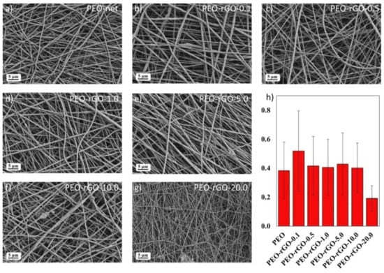 SEM micrographs of electrospun fibers: (a) PEO-net, (b) PEO-rGO-0.1, (c) PEO-rGO-0.5, (d) PEO-rGO-1.0, (e) PEO-rGO-5.0, (f) PEO-rGO-10.0 and (g) PEO-rGO-20.0. (h) Graph of the average fiber diameters with standard deviations.