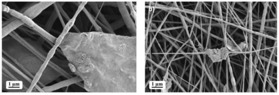 Tissue engineering aims to repair, replace and regenerate damaged tissues. It vastly relies on the use of biodegradable scaffolds, which play a key but temporary role. They mimic the extracellular matrix (ECM) by encouraging cell adhesion and interactions, and facilitating nutrient and waste diffusion, but they simultaneously degrade and are gradually replaced by new tissue []. Fibrous-structured scaffolds are of particular interest in tissue engineering research due to their similarity to the naturally occurring ECM. One of the most promising techniques for fibrous structure fabrication is electrospinning [,,,,,,,]. It is a versatile electrohydrodynamic process, which allows fine adjustment of multiple processing parameters to form predictable ultrathin fibrous structures with the required morphological and topographical features [,,]. Its setup is very simple (consisting of a high-voltage power supply, a syringe pump and a grounded collector) and can be easily implemented not only on a lab scale, but also in large-scale production. Both synthetic (such as polyglycolides [], polylactides [], polycaprolactone [,] and polyurethane [,,,]) and natural polymers (such as collagens [], gelatine [], alginates [], chitosans [,] and silk fibroin []) have been electrospun to be used for biomedical application. The success of electrospun scaffolds in tissue engineering application depends on how closely they mimic the native ECM in terms of composition, structure and porosity [], but also conductivity []. The electrical conductivity of scaffolds could be beneficial especially in enhancing the propagation of both external signals and cell–cell signaling []. This stems from the fact that electrical stimulation is a biologically relevant stimulus, particularly for cardiac, neural and skeletal muscle tissue []. In order to create scaffolds with enhanced conductivity, composite materials are often created mainly by embedding carbon-based nanofillers [,,] or gold particles [] in polymeric matrices.