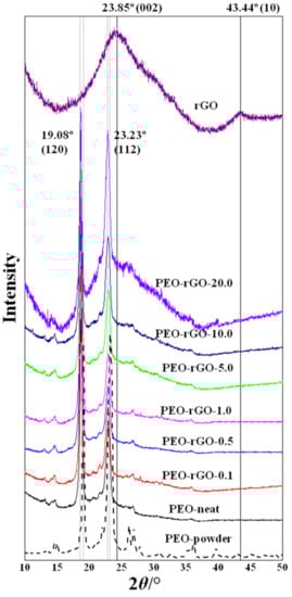 To evaluate the level of dispersion of rGO layers in the PEO matrix, XRD analysis was used. This method is often applied to identify the degree of dispersion of layered nanofillers in polymer matrices. The presence of polymer macromolecules in the interlayer spacing simultaneously increases the degree of dispersion, which is observed as a shift in the diffraction peaks towards lower values of 2θ, and decreases the degree of ordering, which is manifested as the appearance of broader peaks with a lower intensity [,]. Figure 4 shows the XRD patterns of: rGO-powder, electrospun PEO-neat and PEO/rGO samples with different rGO contents (0.1; 0.5; 1.0; 5.0; 10.0; and 20.0 wt%).