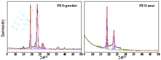 PEO has a monoclinic crystalline structure with its (120) planes parallel to the PEO chain direction and (112) planes intersecting the chain direction []; thus, two strong diffraction peaks at 2θ = 19.08° and 23.23° emerged from these plains, respectively (Figure 4). Interestingly, the XRD pattern of the PEO-powder sample revealed better-resolved and sharper peaks that exhibited a higher intensity in comparison to the PEO-neat electrospun analogue. In addition, several higher-order reflections emerged that were not evidenced in the XRD pattern of the neat electrospun PEO. This could be explained by the fact that the powdered crystallites are randomly oriented, and the Bragg condition is satisfied for more scattering angles, resulting in a greater number of registered diffraction peaks. In other words, this outcome indicates that the formation of the PEO crystalline microstructure is, to some extent, hindered during electrospinning.