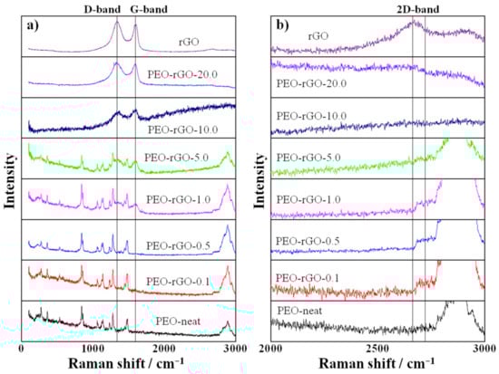 The Raman spectrum of PEO is complex and rich in bands arising from the vibrations of the various molecular units within the polymer conformers. The bands at 1227 cm−1 and 1275 cm−1 are assigned to the CH2 wagging vibrations of trans- and gauche-conformers relative to the C–C bond, respectively, while the peaks at 1123 cm−1 and 1136 cm−1 arise from CH2 twisting vibrations of trans- and gauche-conformers relative to the C–O bond, respectively. The band at 1480 cm−1 is assigned to the CH2 bending vibrations, and the maximum at 844 cm−1 is attributed to the C–O stretching vibration and the CH2 rocking vibration []. Another intensive broad peak that appears at 2878 cm−1 is assigned to the symmetric C–H stretching vibration []. These PEO characteristic modes are present in the Raman spectra of the rGO-modified samples containing up to 5 wt% rGO, most probably because rGO at lower concentrations is majorly fully exfoliated in the PEO matrix. The bands from PEO are diminished in the Raman spectra of the samples containing the highest rGO concentrations, 10 and 20 wt%, because rGO at such high concentrations cannot be totally exfoliated, and the excess remains non-incorporated in the polymer matrix, thus resembling the spectral behavior of its initial, native compound. These considerations are agreeably explained by the manifestation of the D and G bands characteristic for the graphitic structure (G band at 1597 cm−1, emerging from the C–C vibrations of delocalized p-electrons with sp2 hybridization, and D band at 1335 cm−1, distinctive for the defects in the graphitic structures with sp3 hybridization [,]) that start to appear for the samples that contain 1 and 5 wt% rGO, alongside the bands characteristic for PEO. For higher rGO concentrations (10 and 20 wt%), as mentioned above, the spectral dominance features the rGO characteristic bands, D and G, completely suppressing the PEO bands (Figure 6, left panel).