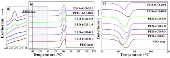 The first cooling thermograms show that the peak crystallization temperature, Tc, slightly downshifted (~3 °C) as the rGO concentration increased from 0.1 to 10 wt%, with PEO-rGO-10.0 showing the lowest crystallization temperature. Then, a slight upshift of 1.6 °C was observed for the sample with the highest rGO concentration (20 wt%). This non-monotonous trend of the crystallization temperature’s dependence on the rGO concentration can be explained by the competition between the nucleation and the confinement effect of the rGO nanolayers [,]. The addition of a well-dispersed small amount of rGO led to the formation of a rigid rGO network, which imposed a confinement effect on further crystal growth, similar to the case of CNT-modified polymer nanocomposites []. Subsequently, the crystallization temperature decreased. The upshift in the crystallization temperature for the sample with the highest rGO concentration (20 wt%) indicated that at this concentration, more polymer chains are in the vicinity of the rGO layers and nucleation therefore dominates the system. Interestingly, for the samples containing 5, 10 and 20 wt% rGO, additional exothermic peaks appeared at ~−25 °C in the cooling thermograms (Figure 7a).