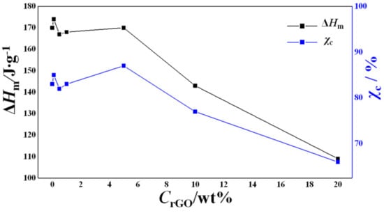 Figure 8 shows the dependence of the enthalpy of fusion (ΔHm) and the weight fractional crystallinities (χc), calculated using Equation (5), on the rGO content.