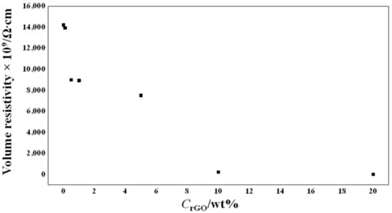 The electrical volume resistivity as a function of the weight content of rGO in the PEO matrix is presented in Figure 9. A significant reduction in the volume electrical resistivity of two orders of magnitude was obtained for the sample containing 10 wt% rGO, and a reduction of four orders of magnitude was obtained for the sample containing 20 wt% rGO. These noticeable reductions in resistivity, especially for the sample containing 20 wt% rGO, probably led to the significant reduction in the fiber diameter, determined by SEM morphological analysis.