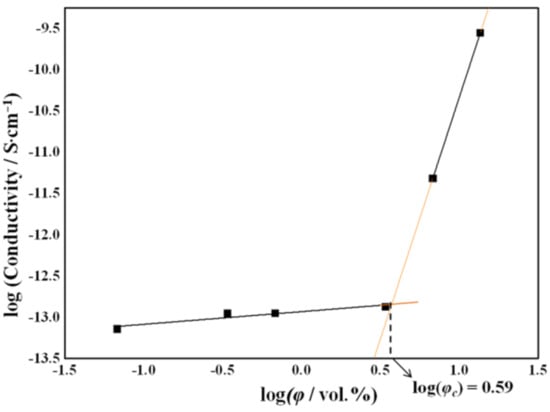 A double logarithmic plot of the conductivity as a function of the filler volume fraction is shown in Figure 10. The experimental data can be linearly interpolated by two different straight lines, thus indicating the presence of two regimes below and above a critical filler concentration. The percolation threshold corresponds to the point where the two straight lines cross each other and was found to be 3.9 vol%, corresponding to a 5.7 wt% rGO concentration.
