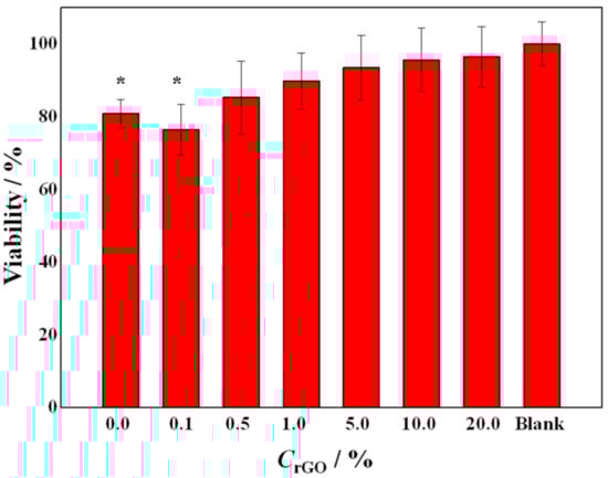 Viability of the cells treated with the liquid extracts from the electrospun samples with different rGO concentrations. The asterisk (*) represents a statistically significant difference (p < 0.01) relative to the untreated cells. The error bars present the standard deviation (n = 8).